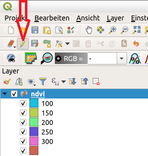 Nachdem der Selektion des Layers „ndvi“ wird mit dem Abakus Symbol der Feldrechner gestartet.